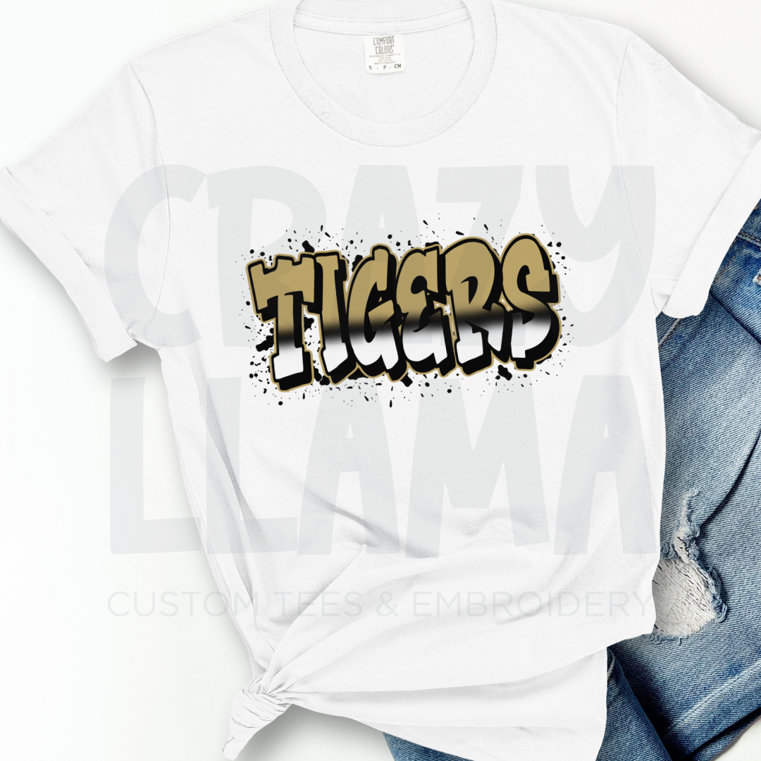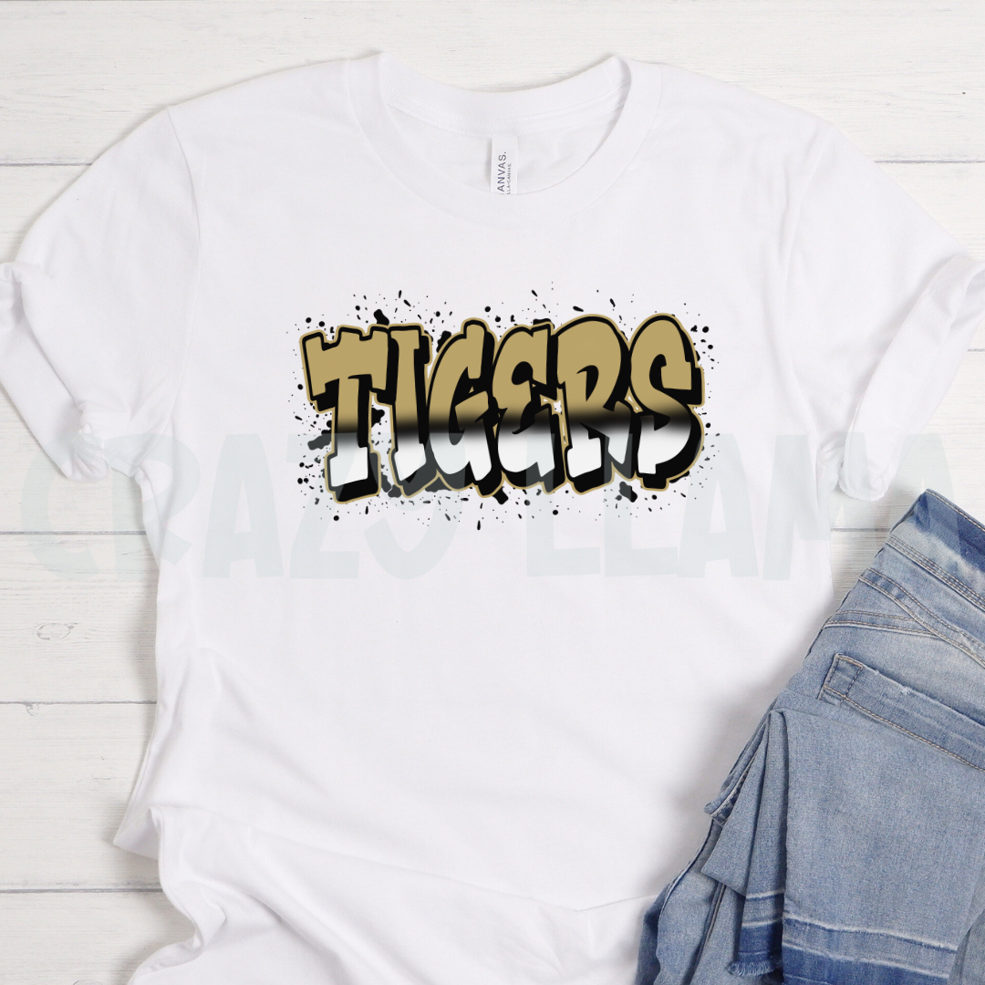 Bring bold energy to game day with our Tigers Graffiti Tee! This standout design features edgy street-style lettering with a black and gold spray-paint effect — perfect for showing your school pride with a little extra attitude.